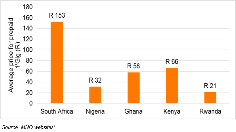 The average prepaid price of data in South Africa compared to average prices in Nigeria, Ghana, Kenya and Rwanda is given below (Figure 1). The prices were calculated as the average price for one gigabyte of 30-day prepaid data charged by a number of MNOs in each country including MTN.1