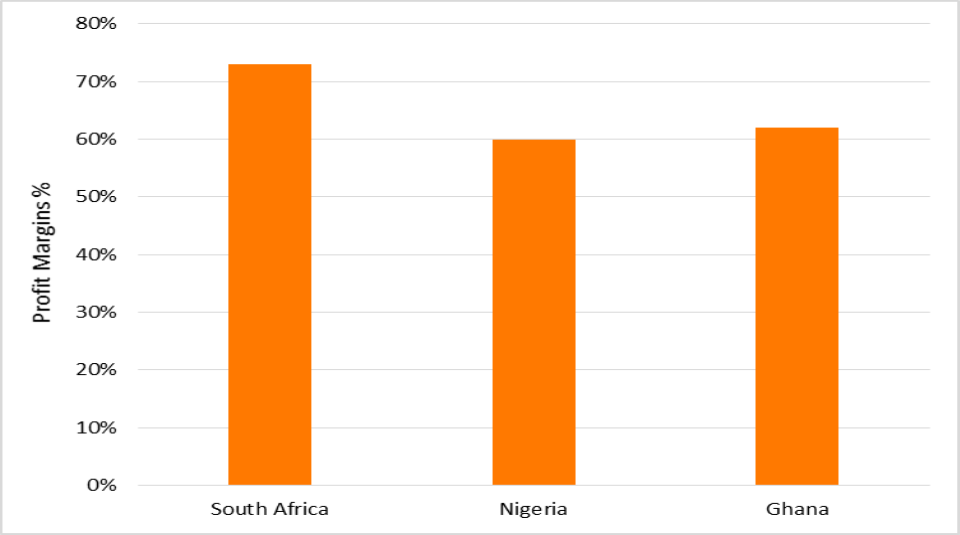 Although South Africa has higher total costs relative to Nigeria and Ghana, company margins show that on average South African margins are on average 22% higher than Nigeria and Ghana.