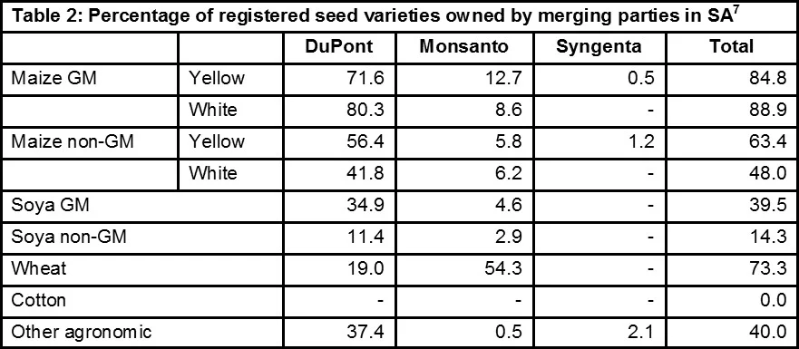 In South Africa, DuPont (Pioneer), Monsanto and Syngenta control 85% market share in the genetically modified maize seed market. Although Syngenta has limited participation in South Africa, it will have links through Adama South Africa, a manufacturer and distributor of crop protection solutions, owned by ChemChina following the approval of the merger with ChemChina.