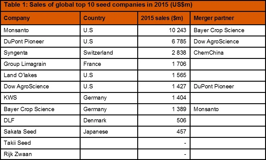 The global seed market is highly concentrated with a few lead international players led by Monsanto, DuPont and Syngenta (Table 1).1 In 2017, Monsanto merged with Bayer Crop Science; DuPont Pioneer merged with Dow AgroScience; and Syngenta acquired ChemChina. The main reasons driving these mergers and acquisitions include the need to secure and expand into new markets and diversify the company portfolios following the decline in prices of crops and cereals.2The approval of the above mergers will result in three corporations controlling close to 60% of the global patented seed market and 64% of the agrochemical market.